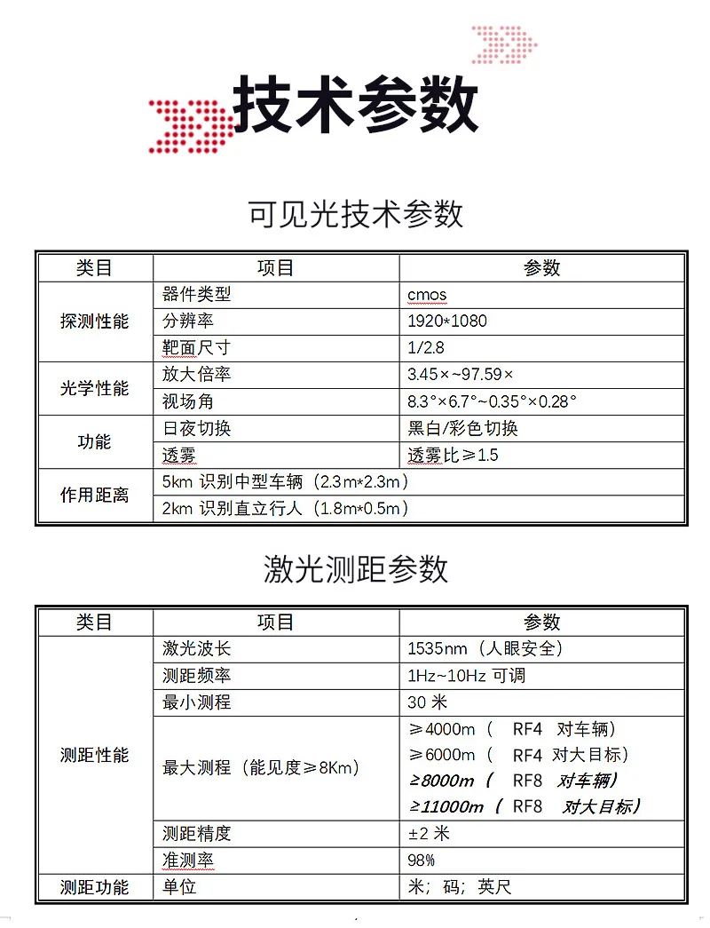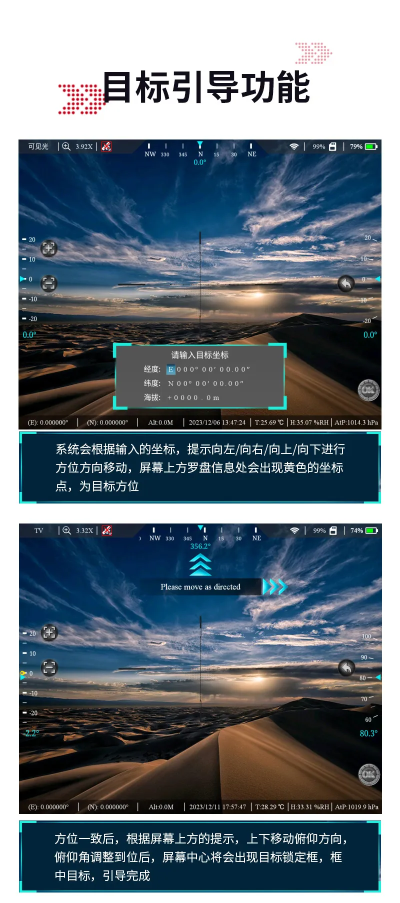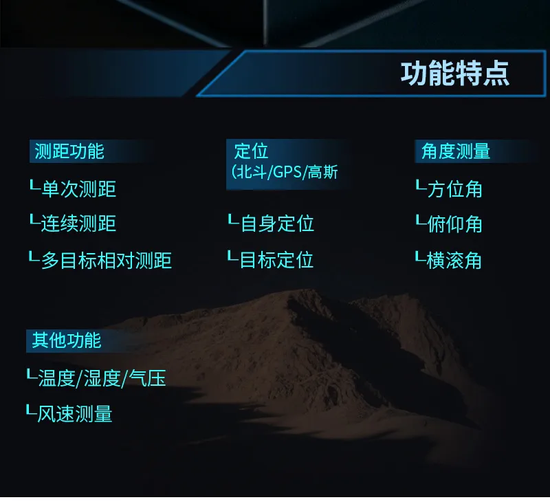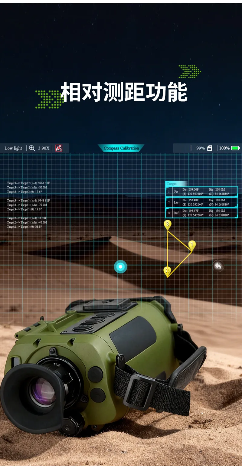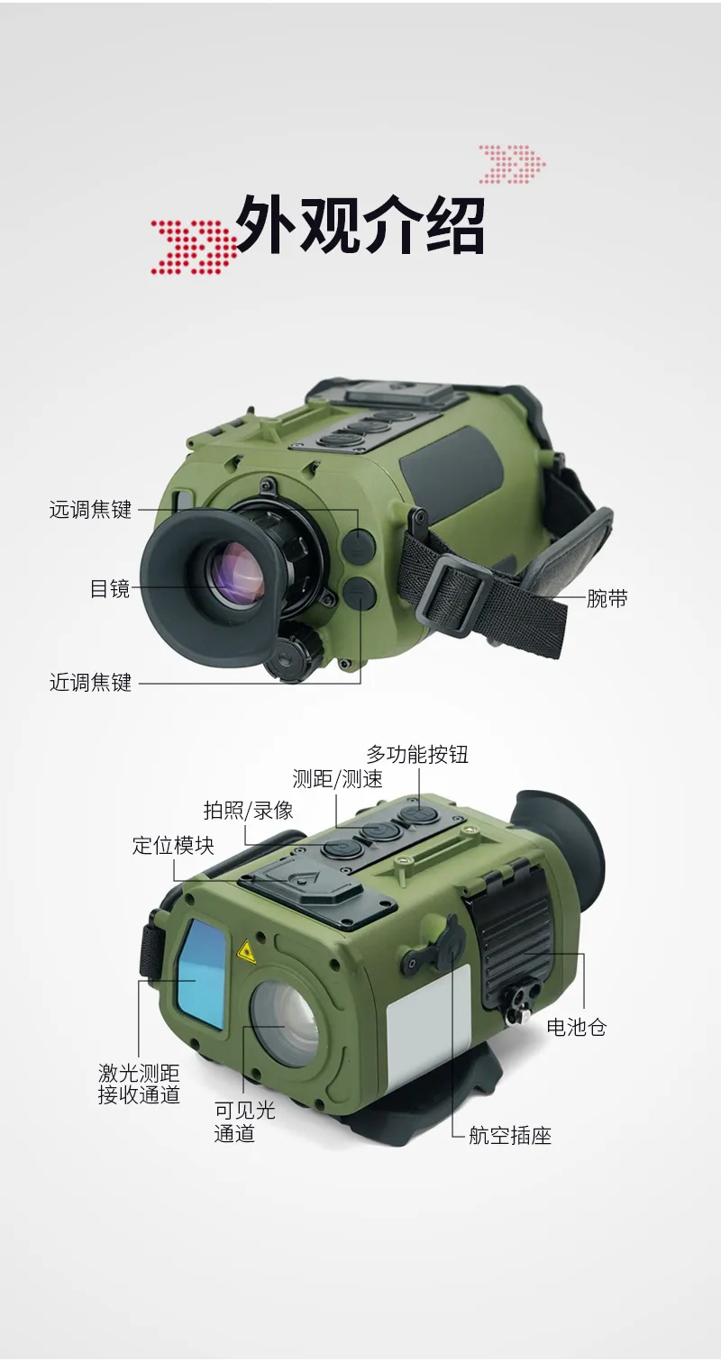 智能化便携式单目手持激光测距设备,内置低照度相机模组、激光测距模组、数字式电子罗盘、GPS定位模块、显示模块以及中央信息处理单元,集合高精度单次测距、连续测距、多目标相对测距及存储记忆功能,可用于昼夜间对目标的探测发现、精确定位、执法记录以及辅助决策。