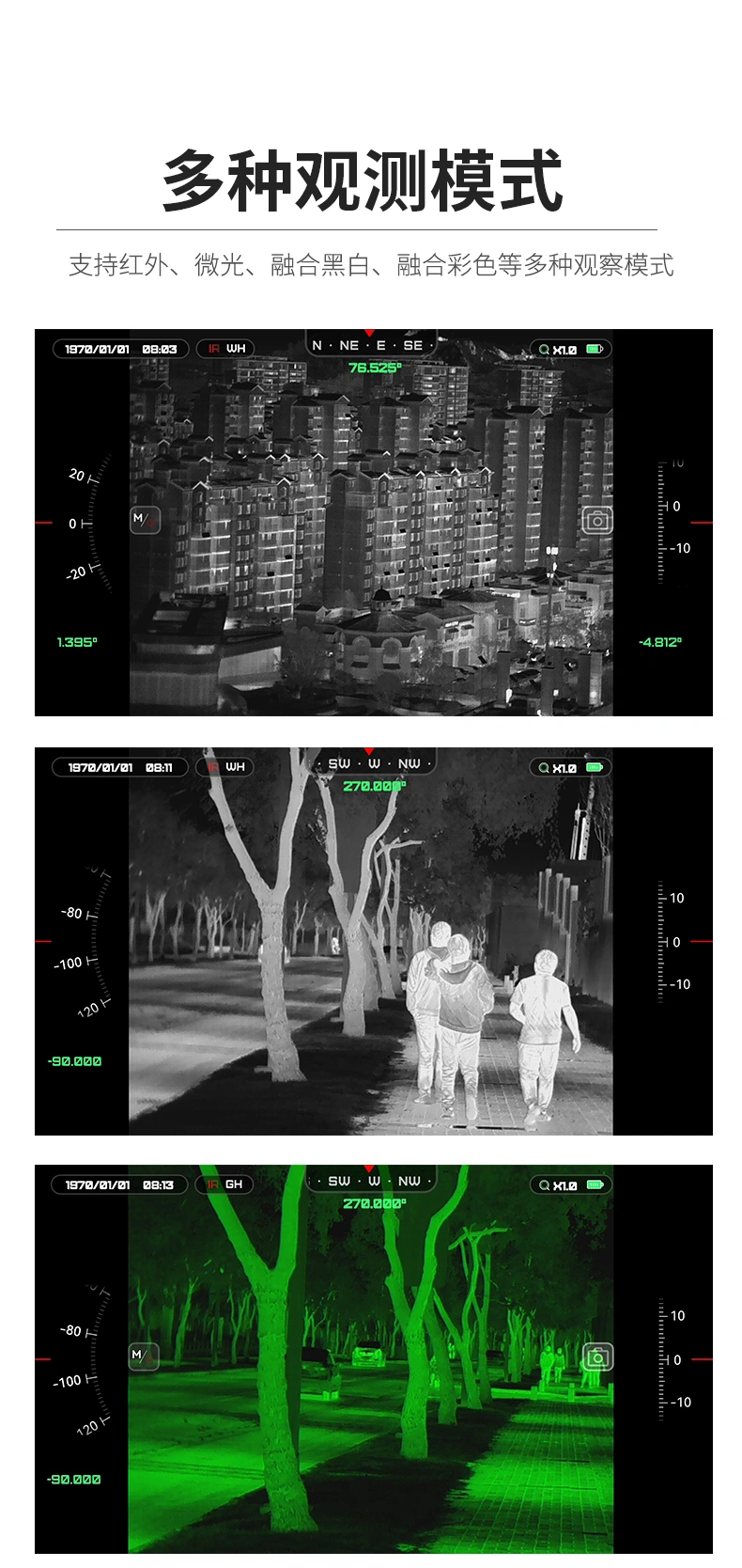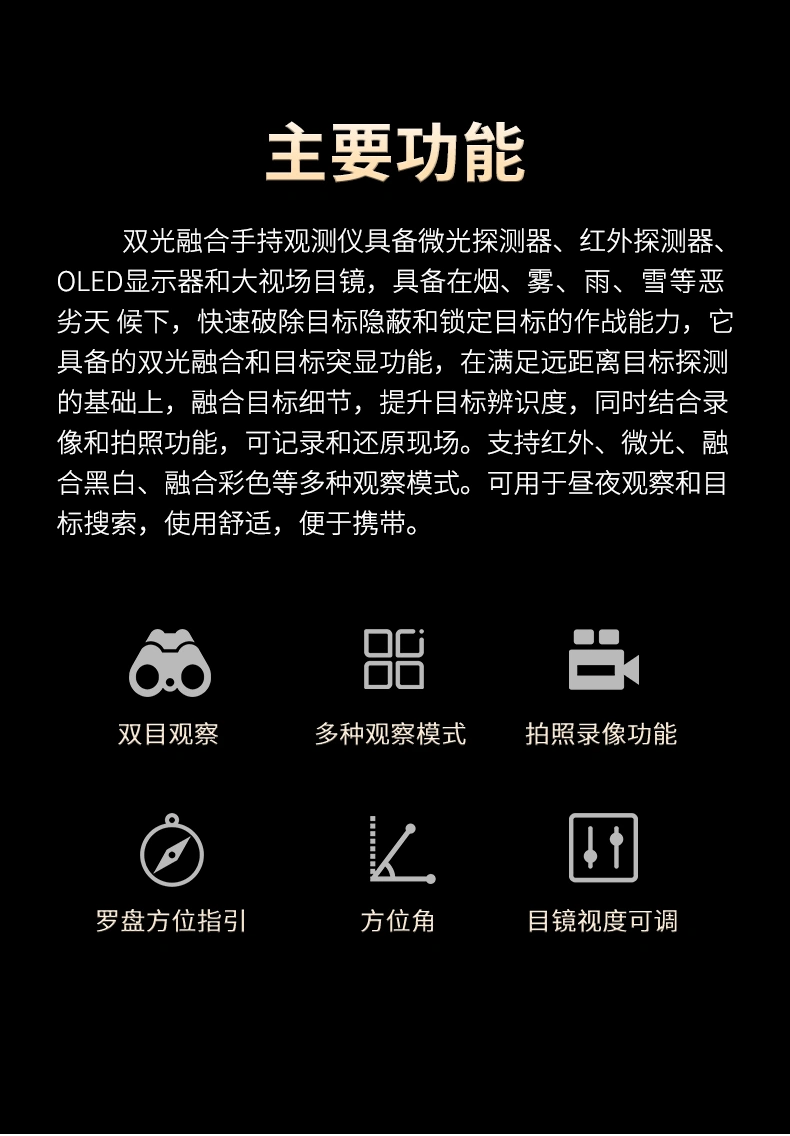 双光融合手持观测仪具备微光探测器、红外探测器、OLED显示器和大视场目镜,具备在烟、雾、雨、雪等恶劣天候下,快速破除目标隐蔽和锁定目标的作战能力,它具备的双光融合和目标突显功能,在满足远距离目标探测的基础上,融合目标细节,提升目标辨识度,同时结合录像和拍照功能,可记录和还原现场。支持红外、微光、融合黑白、融合彩色等多种观察模式。可用于昼夜观察和目标搜索,使用舒适,便于携带。