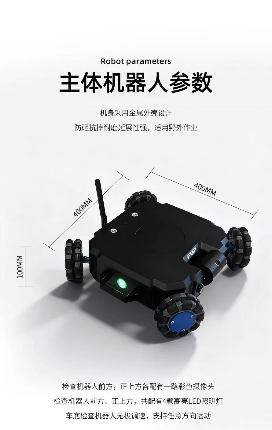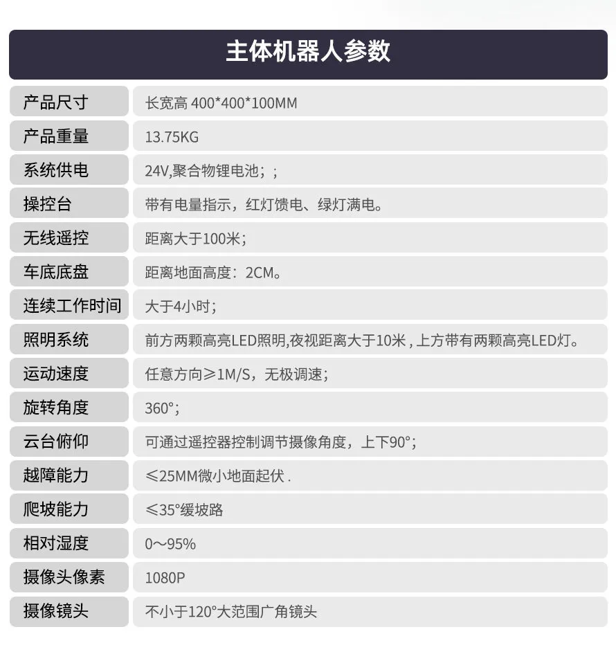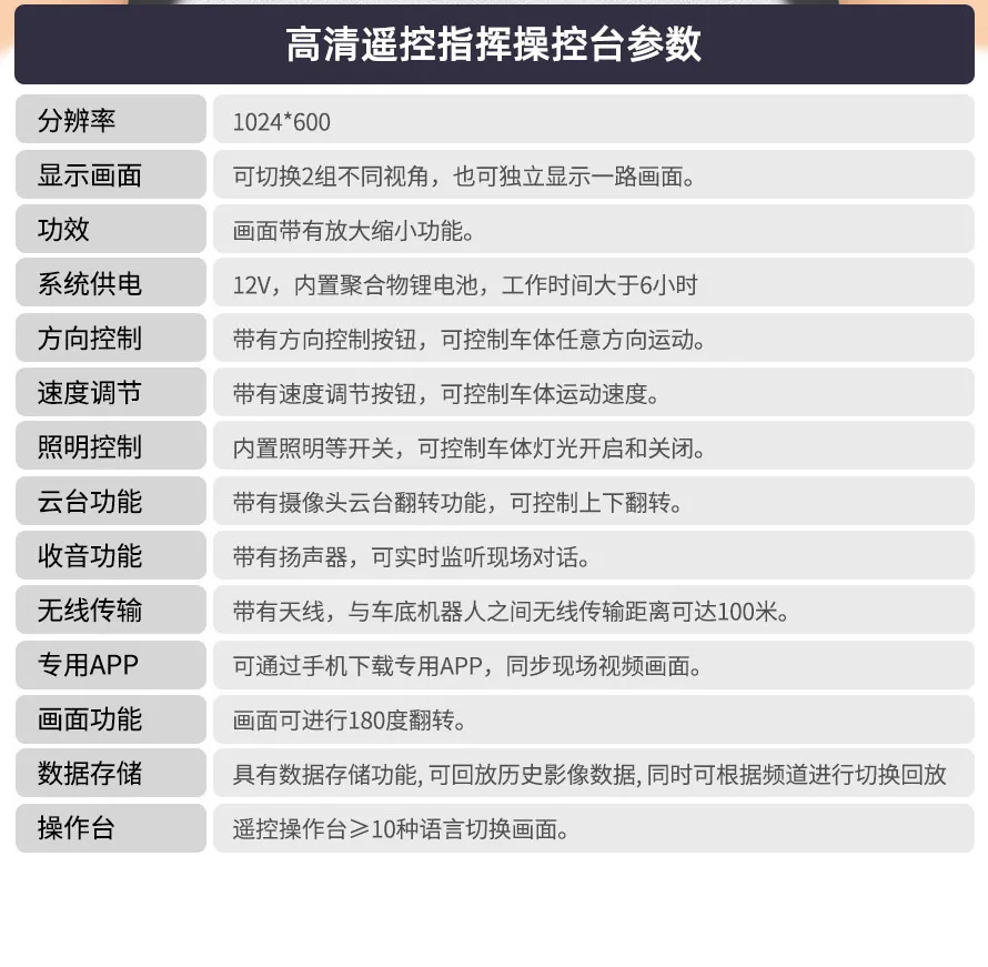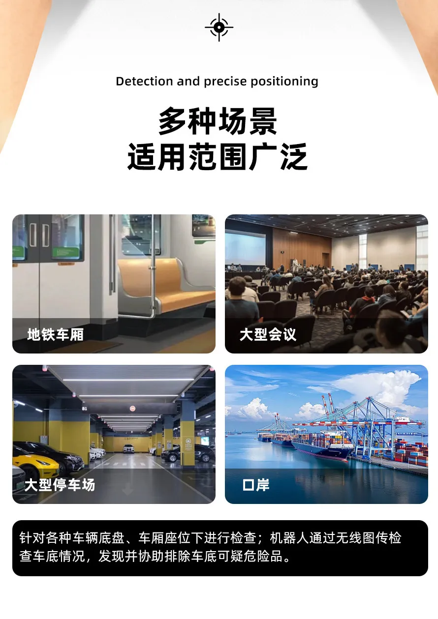 该产品适用于大型活动临时安检、临时检查站等安检区域对汽车底盘进行检查,地铁车厢,轨道等的巡检等功能,主要应用于地铁车厢、大型会议、大型停车场、海关口岸等场景,专门针对各种车辆底盘、车厢座位下进行检查;机器人通过无线图传检查车底情况,发现并协助排除车底可疑危险品。
