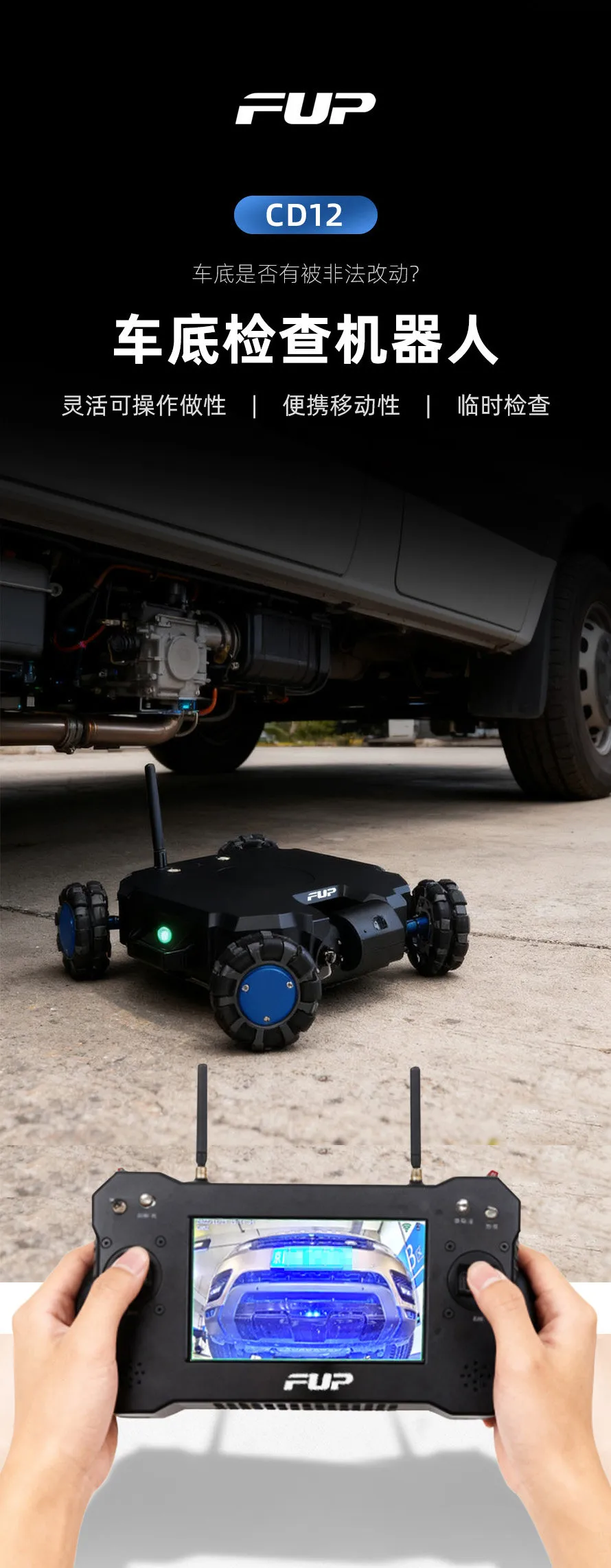 CD12车底检查机器人,主要用于车底是否有被非法改动,藏匿毒P、Z弹等违禁物品或人员 ,还可以检查到人体不便到达的地方,具有灵活的可操作做性,具有便携移动性强,满足各类移动临时检查的需求。